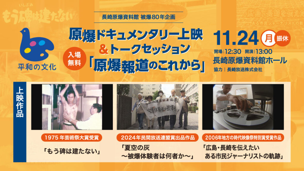 「被爆体験を語り継ぐこと」がますます重大なテーマとなった被爆80年のことし、長崎原爆資料館では、原爆をテーマにしたドキュメンタリーを特別上映すると同時に、新旧番組制作者と被爆者、若者のトークセッションを実施。これからの原爆報道、被爆地からの発信の在り方について共に考える機会といたします。